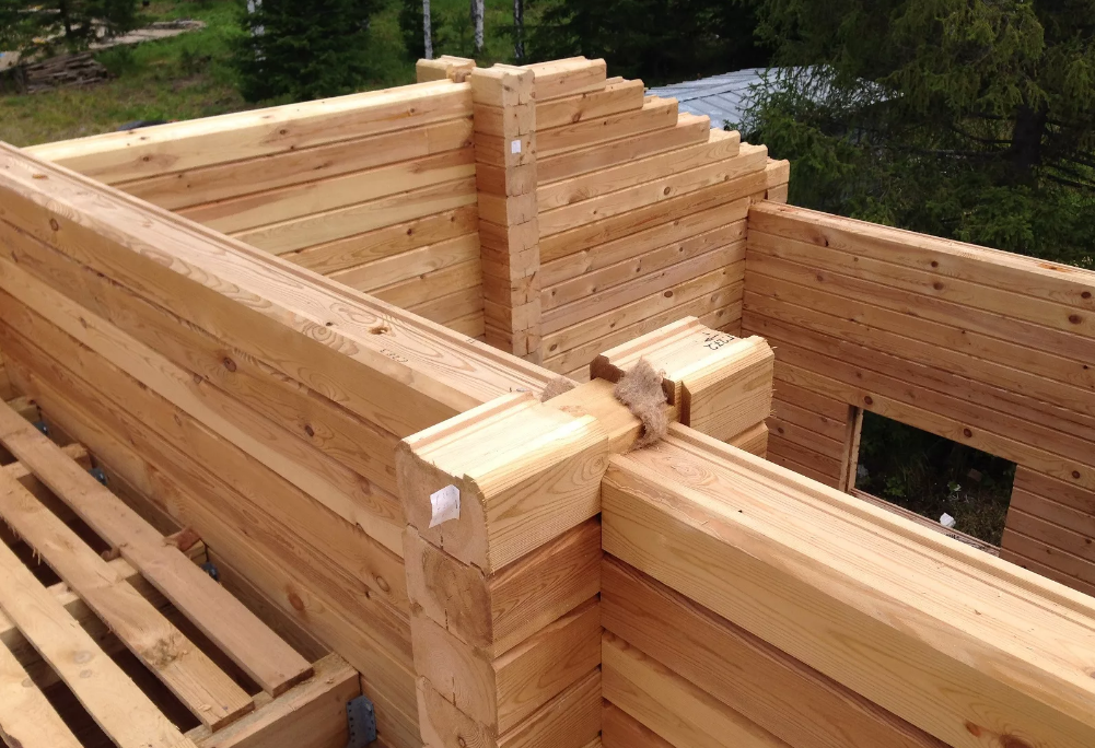 В процессе сборки формируются проёмы под двери и окна. После возведения стен дальнейшие сроки работ зависят от того, какой именно профилированный брус используется — естественной или камерной сушки. В первом случае потребуется сделать паузу в строительных работах примерно на полгода для усадки выставленного сруба. Влажность бруса естественной сушки составляет около 22–30%, камерной — 12–20%, т. е. сруб из естественно высушенного бруса осядет примерно на 7–10%, высушенный в камере — на 3%. Если же времени на усушку не выделять и полностью закончить здание, то неизбежны смещения в оконных и дверных проёмах, а также в отдельных участках сопряжения стен и перегородок. Строительные работы с использованием профилированного бруса камерной сушки не требуют перерыва на усушку сруба, что позволяет закончить строительство в короткие сроки.