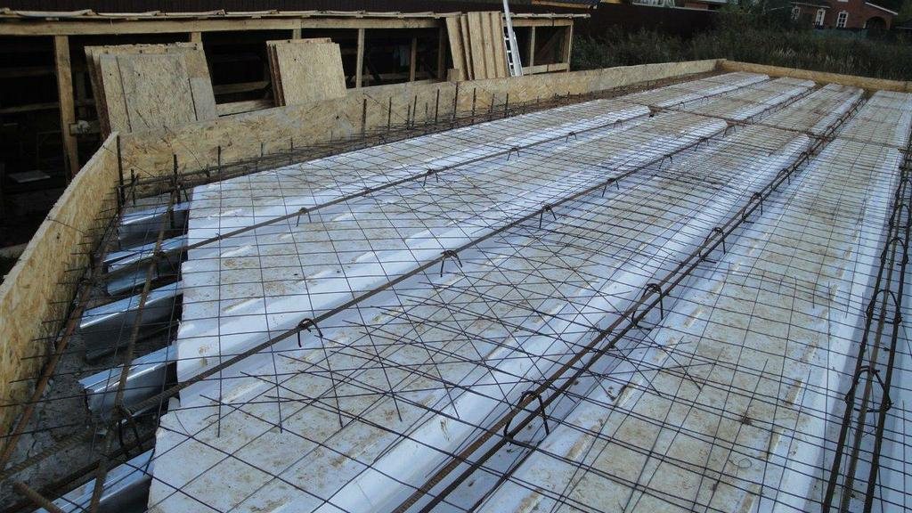 При укладке бетона лотки превратятся в мощные ребра жесткости, а поверхность фактически в стяжку поверх утеплителя. Этажом ниже это будет выглядеть обычным ровным потолком, который легко поддается шпаклевке и чистовой отделке. Толщина заливки в самой верхней точке должна составлять не меньше 50 мм, но и слишком толстой ребристую плиту делать не нужно. Это позволит значительно сократить расходы на материалы, не потеряв прочности конструкции.