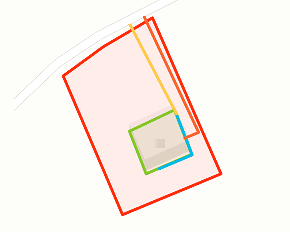Мой ситуационный план. Рисовать лучше на компьютере. Красная линия — границы участка, зеленая — капитальные строения, например дом, баня или гараж, оранжевая — существующие и проектируемые коммуникации, желтая — газопровод под землей, а синяя — по цоколю дома