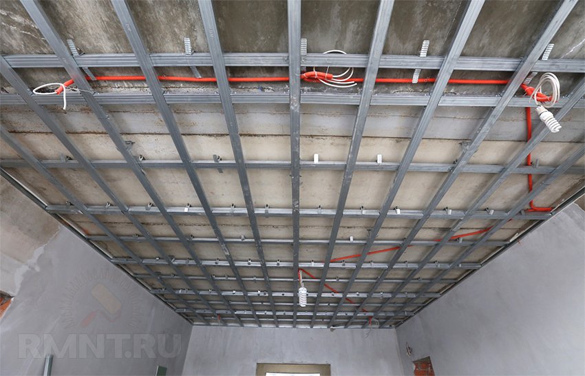 Совет. Если подвесной потолок имеет несколько уровней, каркас лучше закрепить на горизонтальной и вертикальной плоскости.