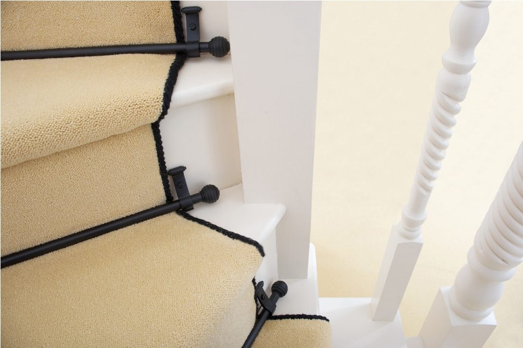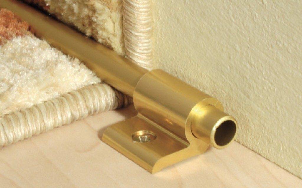 Это самый распространенный способ, который чаще всего используется, если нужно закрепить ковровую дорожку на лестнице. Что же касается покрытия, то оно стелется на ступеньки с равным отступом от краев, после чего полотно прижимаются специальными штангами в углах.