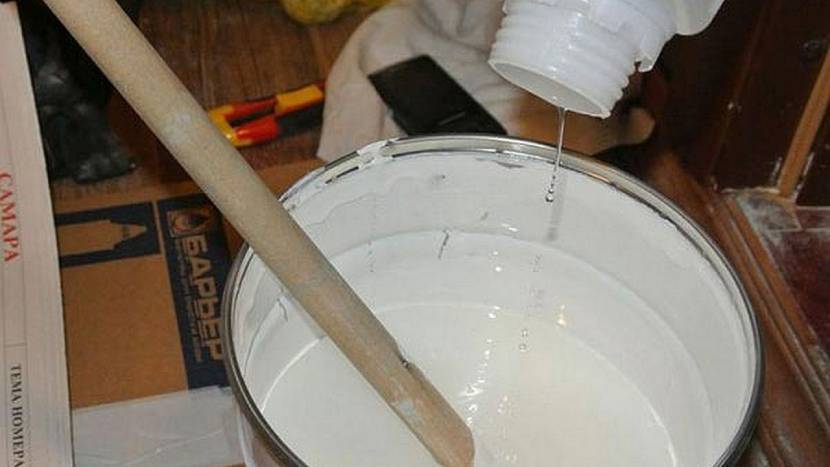 Если нужно наложить очень тонкий слой, который равномерно ляжет на поверхность, специалисты советуют добавлять две части воды (на литр 200 мл). Чем больше воды, тем тоньше получится слой краски.