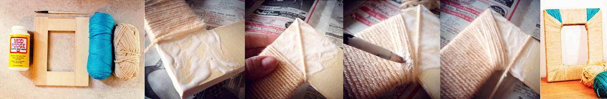Веревочная обмотка может иметь и самостоятельное декоративное значение в рамке для малоценных фото (справа на рис). Если же предполагается таким образом обрамить ценный отпечаток, то рамку нужно делать плоскую со столярными соединениями углов, см. напр. видео урок, как простым способом соединить углы рамки из дерева: