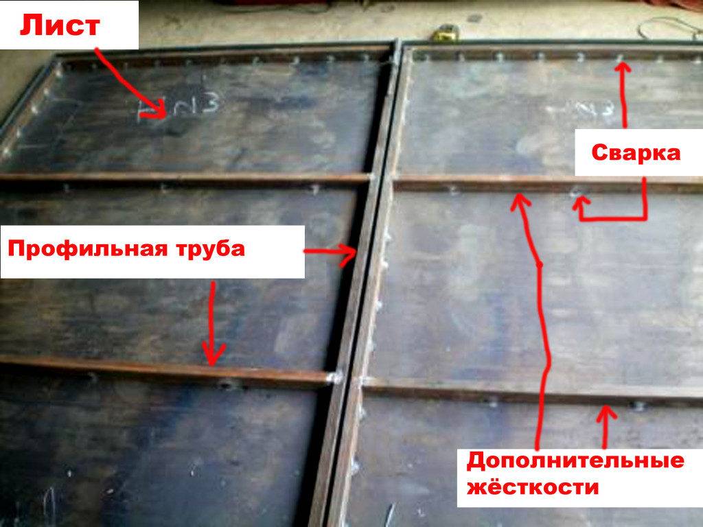 Вы можете купить в магазине уже готовые створки, а можете сделать их своими руками. Для этого потребуется сварить каркас, состоящий из профильных труб. Чтобы форма рамы сохранялась, изнутри необходимо приварить ее.