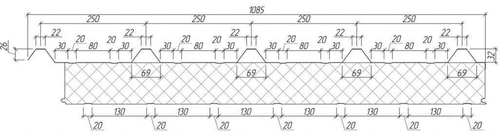 Кровельные сэндвич-панели выпускаются в рабочей ширине 1000 мм. Полная (до монтажа) ширина кровельных сэндвич-панелей, включая замки R-Lock составляет 1085 мм. Для выпуска Кровельных сэндвич-панелей применяется один вид профилирования с пятью ребрами жесткости трапециевидной формы.