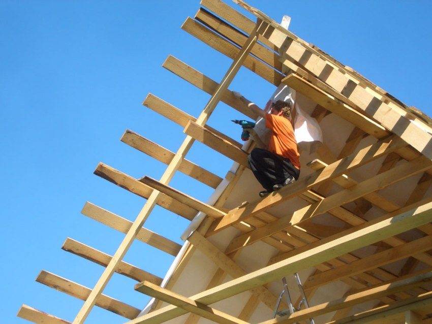 Степень сложности работ во многом зависит от того, какая конструкция выбрана для монтажа. Если требуется делать наслонные стропила из досок или бруса, каждый элемент подгоняется по месту установки при креплении его к коньковому прогону и мауэрлату