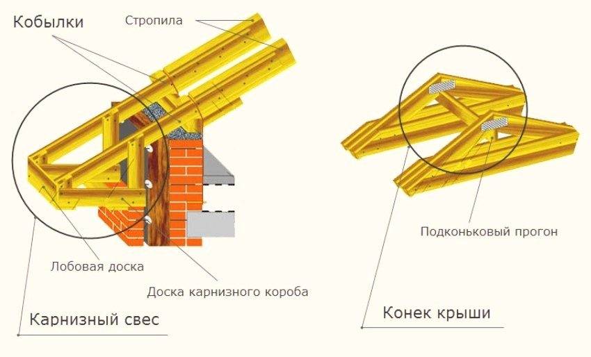Для прочности соединения используются болты, нагели и скобы, а также зуб и пластины из металла. Чтобы избежать попадания осадков на нижнюю часть стропильной системы, осуществляется монтаж отвесов. Технологический процесс установки кровли предполагает ее вынос за границы внешних стен на 50 см. Карнизный отвес должен быть не менее 550 мм.