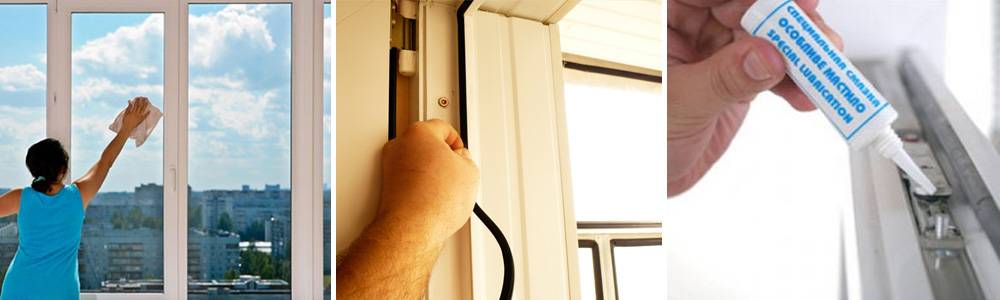 После мытья все поверхности надо обязательно вытереть, уделив особое внимание металлическим элементам фурнитуры; Смазать сопрягаемые элементы подвижных механизмов подходящим смазочным материалом. В продаже имеется специальное средство для смазывания фурнитуры. При его отсутствии можно воспользоваться автомобильным маслом либо промышленным вазелином; Открыть и закрыть створку несколько раз, чтобы добиться равномерного распределения смазки по поверхности; Остатки смазочного материала удалить с помощью ветоши