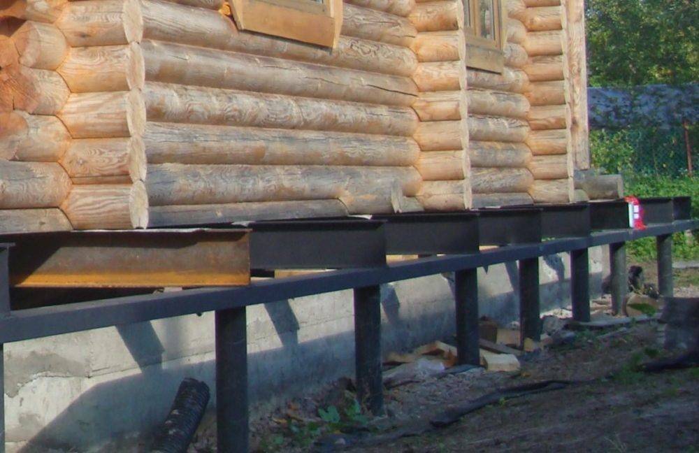 - После того как домкраты будут опущены, на них необходимо уложить новое несущее бревно и, подняв устройство над опорами, плотно его зафиксировать. Так нужно сделать со всех сторон здания.