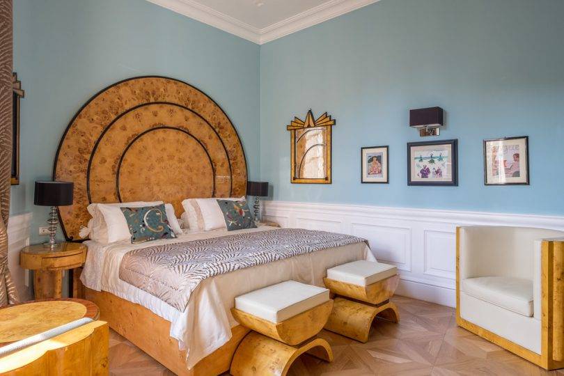 Резная мебель, окрашенная эмалью в тон слоновой кости, создаст величественную атмосферу дворца. Изголовье кровати может быть оббито мягкой кожей. Окна следует закрывать портьерами из парчи, бархата, атласа в тон общего оформления. Такие же ткани подойдут и для балдахина. Покрывало может быть жаккардовым, с мерцающими рисунками. Обилие света в «драгоценном» обрамлении превратят обычную маленькую комнату в поистине королевскую опочивальню.
