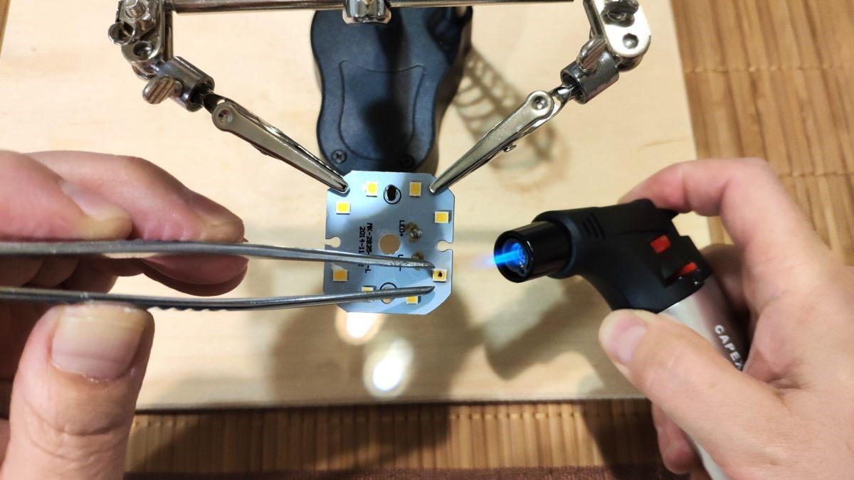 плату необходимо закрепить так, чтобы паяльник или паяльная лампа могли пройти к перегоревшему светодиоду.