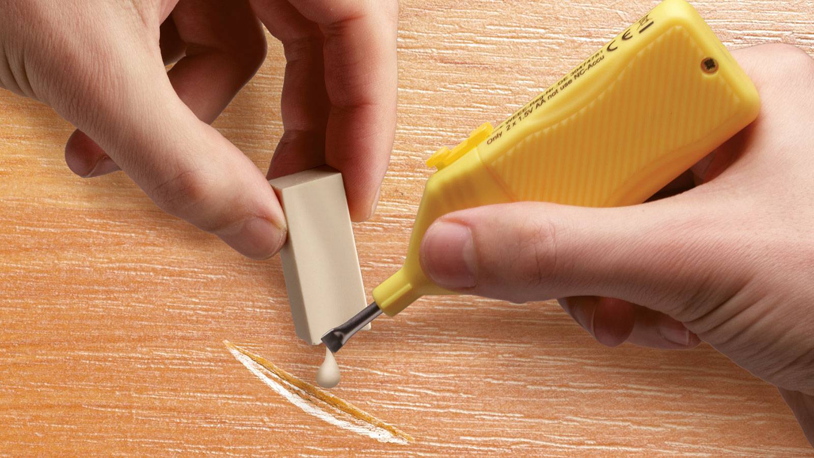 - Мебельный маркер. Его также удобно использовать для маскировки мелких царапин. Кроме того, с его помощью удобно затемнять края глубоких царапин перед тем, как наносить воск или штрих. Маркер не оставляет подтеков и быстро высыхает.