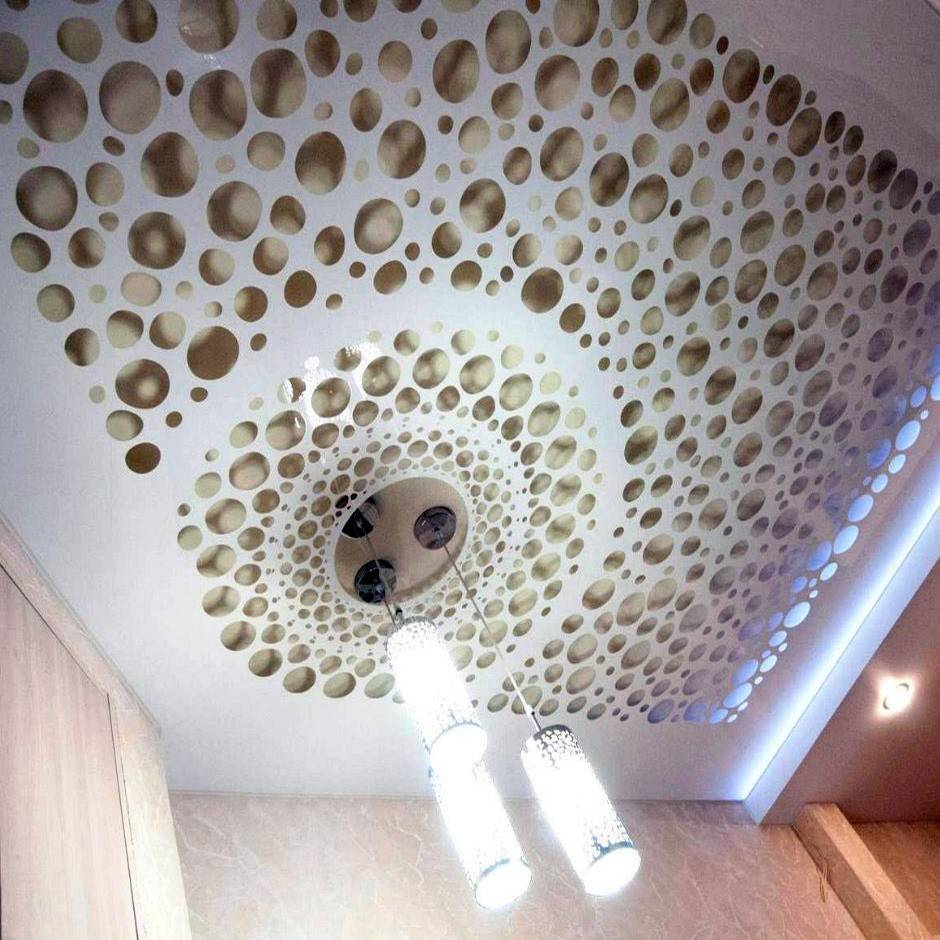 Такой потолок сегодня находит применение в различных интерьерах. Сложные орнаменты органично впишутся в дизайн комнаты, выполненной в восточном стиле, крупные круглые отверстия на потолке подчеркнут смелость направления «хай-тек». Симметричные изображения органично выглядят, если их сочетать с люстрой в центре потолка, а разнообразные точечные светильники или светодиодные ленты лучше применять в качестве для фонового полотна.