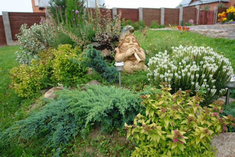 Поддержать доминирующие растения в каменных садах способны можжевельники: чешуйчатые «Blue Star» и «Blue Carpet» или горизонтальные типа золотистого «Golden Carpet», а также Микробиота перекрестнопарная. Кроме того, в «группе поддержки» могут оказаться: