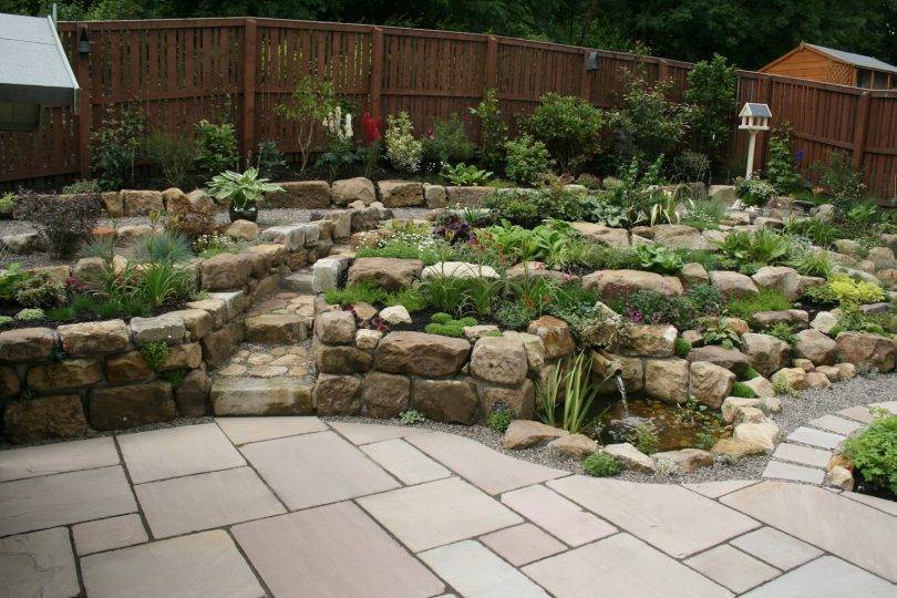 с подпорными каменными стенками, с живыми каскадами и водоемами.