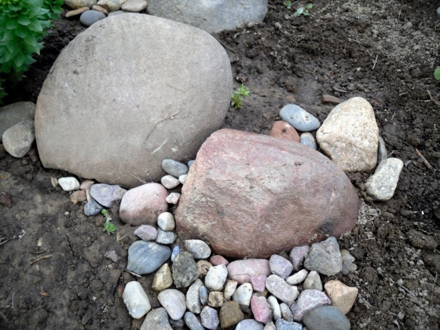 Для проверки, качественно ли закопан валун, его надо слегка покачать. Для красоты и природности иногда нужно, чтобы несколько небольших камней подпирал один крупный. Подобные композиции можно скреплять клеем или цементным раствором.