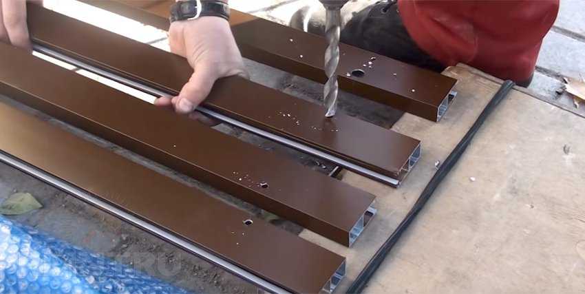 Начинается монтаж с подготовки элементов. Направляющие шины сверлят в 10–20 см от краёв, затем располагают нужное количество отверстий для крепления по всей длине с равными отступами не более 40 см. Для плотного прилегания с изнаночной стороны шин отверстия зенкуют, с передней — расширяют до установочного диаметра заглушек для свободного входа шляпки крепёжного элемента. Также сверлится короб с накладной крышкой под диаметр используемых заклёпок. Сверлить нужно в тех местах, где расположены усиленные язычки боковых крышек.