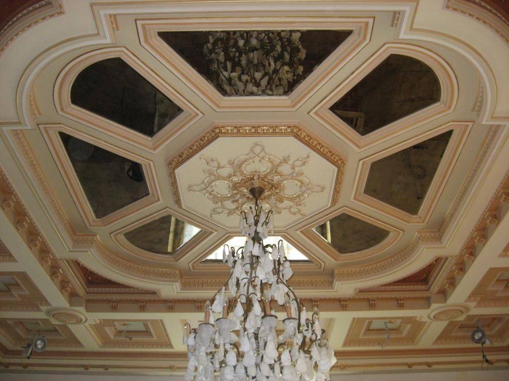 Это в небольшой комнате в качестве потолочного декора под люстру может использоваться простой накладной круг с орнаментом из полиуретана. В дорогих и роскошных интерьерах, выполненных в классических европейских стилях (особенно в стиле Палладио) используется сложнейшее оформление. Над проектами потолков залов известных дворцов прошлых столетий архитекторы трудились месяцами. Даже в наши дни, у посетителей Версаля или Зимнего дворца захватывает дух, когда они поднимают голову вверх, находясь в интерьерах парадных залов. Ведь они видят там не какую-то «розеточку» под люстру, а грандиозное произведение искусства. Некоторые особо состоятельные граждане, владельцы дорогих особняков, не жалеют миллионов на подобные проекты. Ниже представлено фото невероятно сложного потолка, в котором используется и лепнина, и позолота, и специальные зеркальные вставки.
