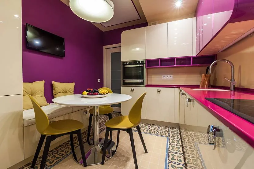Если же окна кухни выходят на юг, то вы можете выбирать холодные тона: лавандовый, малиновый, маджента, фуксия и пр. как на следующих фото.
