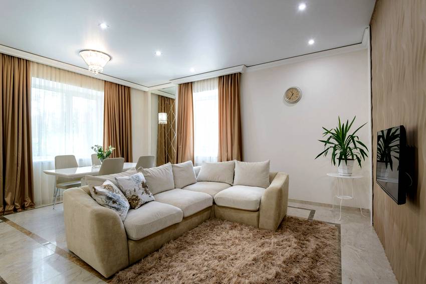 Как правило, зал и гостиная комната отличаются большим размером, чем остальные помещения в квартире. Поэтому здесь можно реализовать самые сложные и оригинальные проекты. Совсем не обязательно делать белый потолок, он может быть в пастельных тонах, что позволит сгладить острые углы. Кроме того, сатиновый потолок будет испускать мягкий свет, придавая помещению уют и тепло.