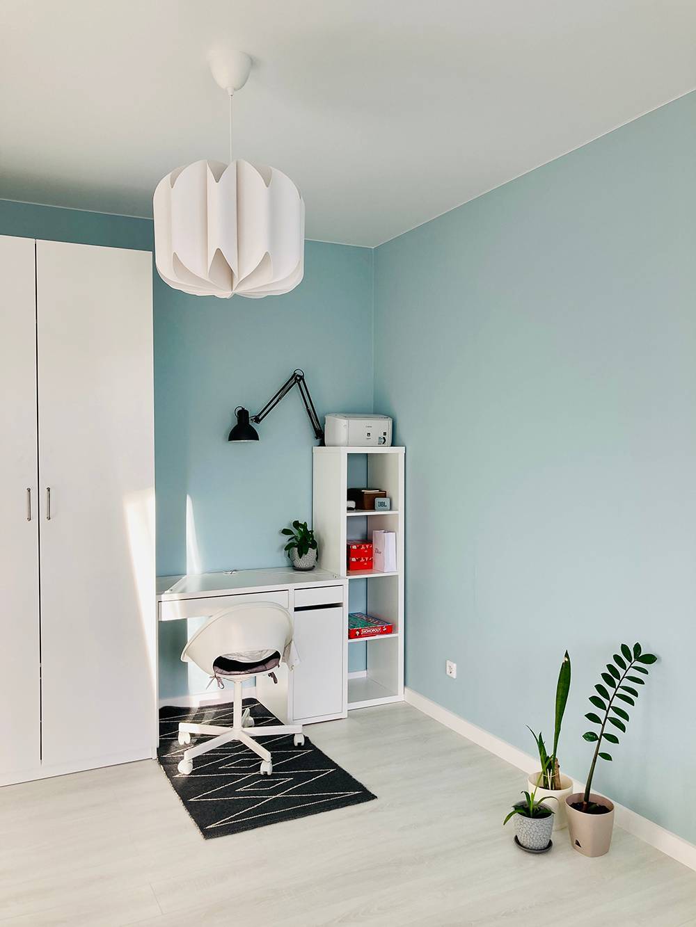 Особое внимание я уделил дальней стене в спальне. Из ее длины я вычел толщину плинтусов и в оставшееся расстояние идеально уместил шкаф, стол и стеллаж
