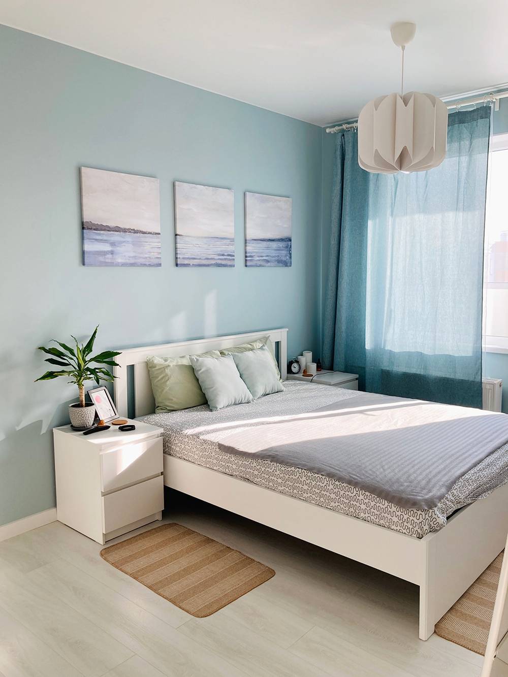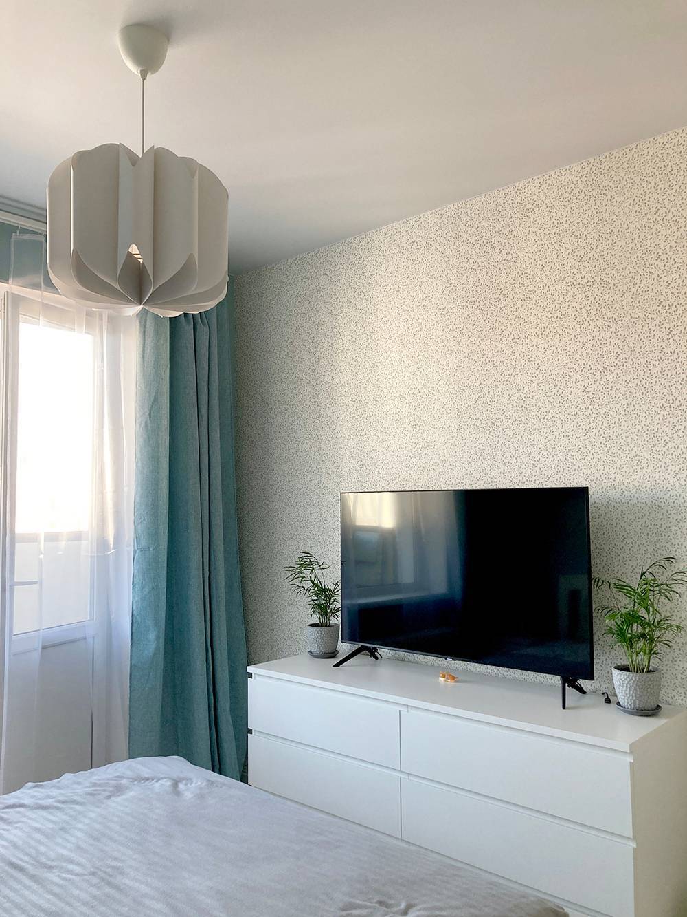 Абажуры в спальне расположены так, чтобы не мешать закрывать шторы и открывать дверь и шкаф.