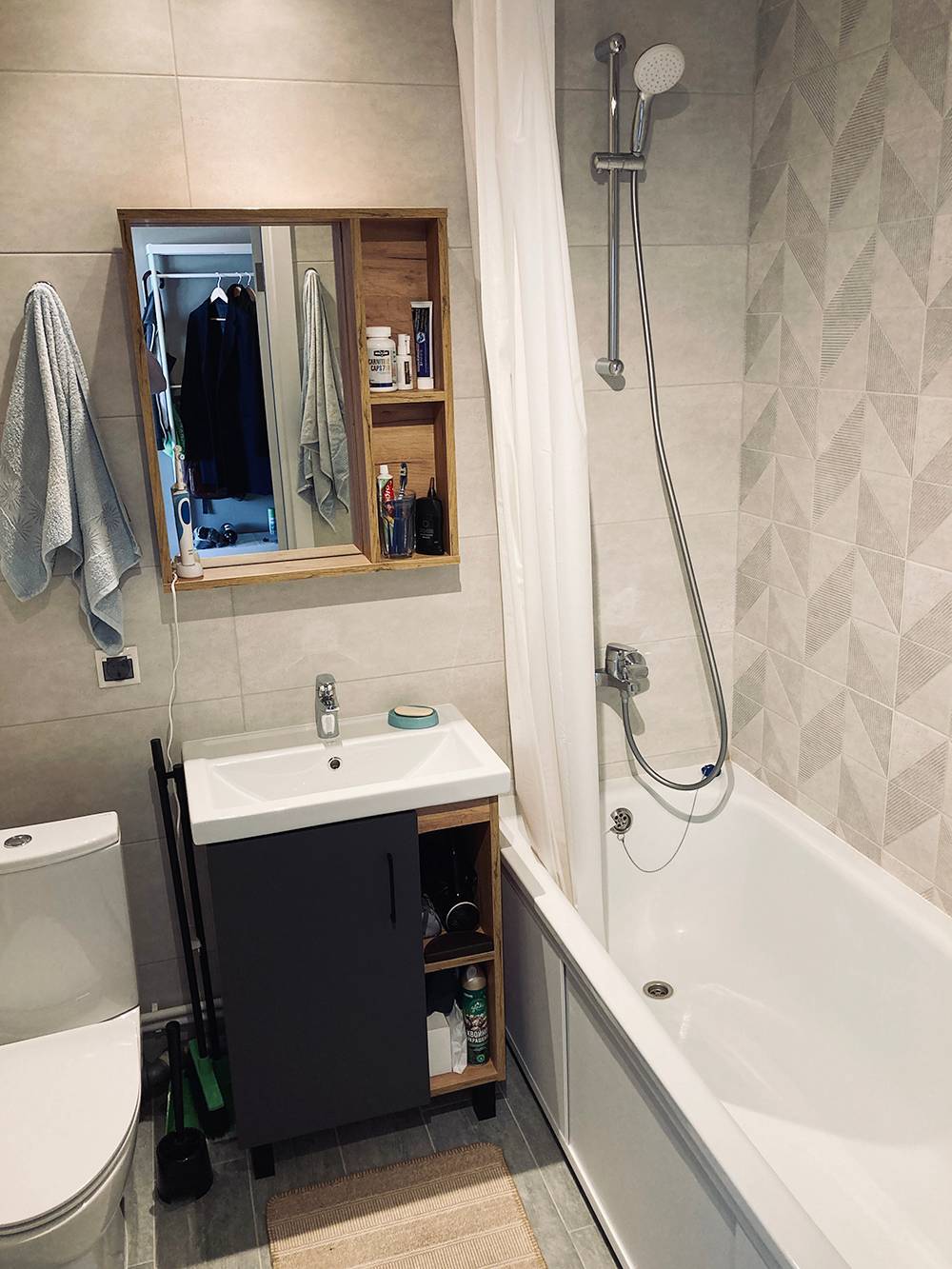 Санузел. Санузел продуман до мелочей, поэтому на 4 м² уместилась просторная ванна, раковина, унитаз, стиральная машина — и осталось еще много места. Я выбрал обычный унитаз и отказался от инсталляции, поскольку она дорогая, а обслуживать ее в случае неполадок сложно. На плитку, металлическую ванну, сантехнику Cersanit и Grohe ушло в сумме около 75 000 Р.