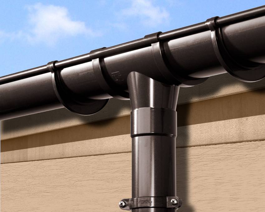 Каждая водосточная труба предполагает по 10 м желоба. В местах их крепления вырезается V-образное отверстие шириной 10 см, куда вставляется воронка. Она закрепляется на 10 см от края желоба. Держатели устанавливаются до момента монтажа карниза крыши через каждые 50 см, обеспечивая уклон желоба, равный 5 мм. С обеих его сторон фиксируются заглушки.