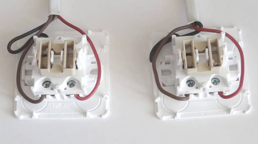 Самостоятельное выполнение установки двухклавишного выключателя отличается от монтажа одноклавишной конструкции только количеством кабельных жил, подводимых к устройству, а также количеством клавиш. Процесс подключения двухклавишных проходных элементов требует заведения пяти отдельных кабельных жил на первую конструкцию, и шести жил кабеля – на второе устройство.