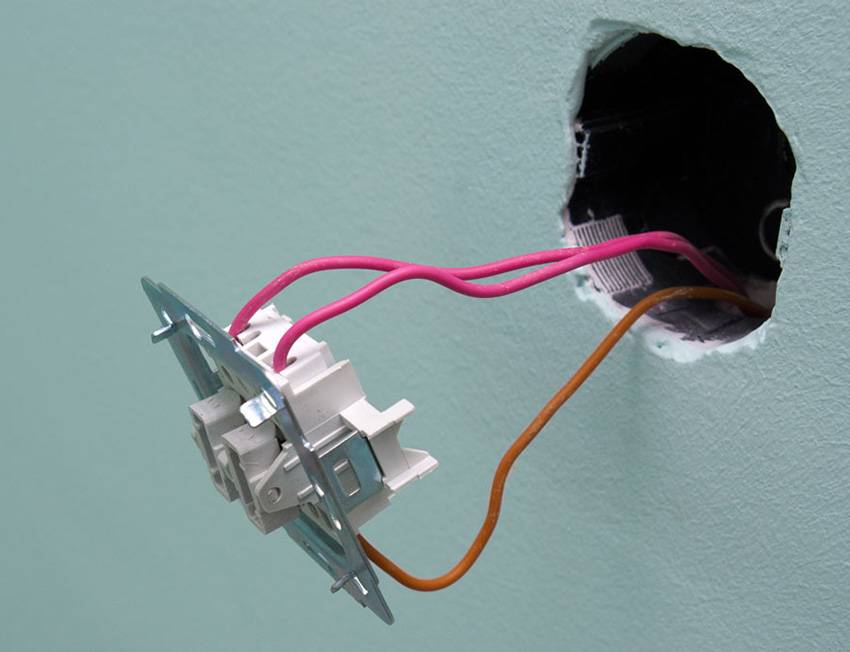 Монтажные работы при использовании одноклавишных выключателей начинаются с разметки под установку распределительного короба. Коробку нужно монтировать под потолком, на одинаковом расстоянии от выключателей. От щитка к коробу проводится «ноль» и «фаза», после чего от распределителя до места установки выключателя прокладывается штроба под укладку трёхжильного кабеля. Перфоратором и специальной насадкой в стене проделывается углубление для установки подрозетника, который фиксируется гипсовой шпаклёвкой.