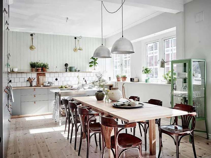 Кухня в скандинавском духе предполагает комбинацию модульных и подвесных систем хранения, а также обеденный остров с добротным «семейным» столом.