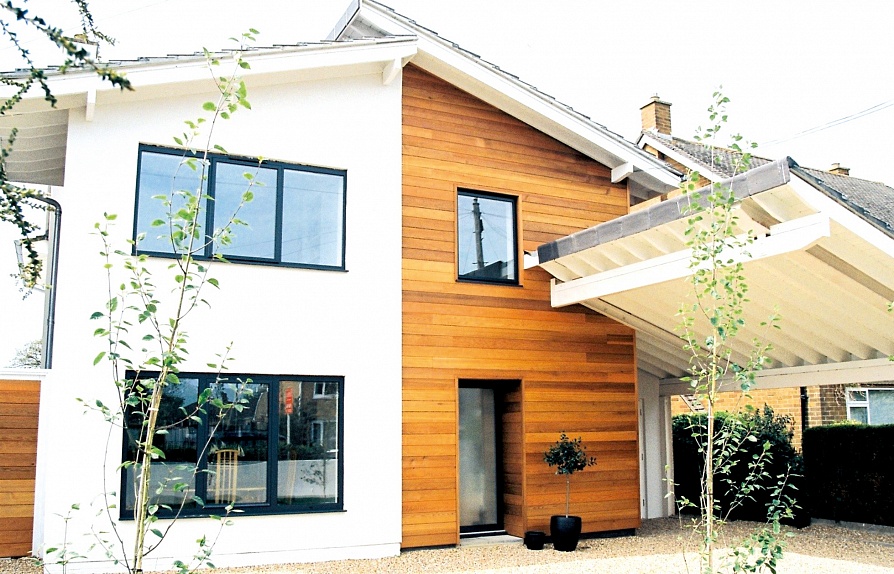 В оформлении дома используются контрасты, например, при светлой отделке используются темные стеклопакеты или декоративные балки.