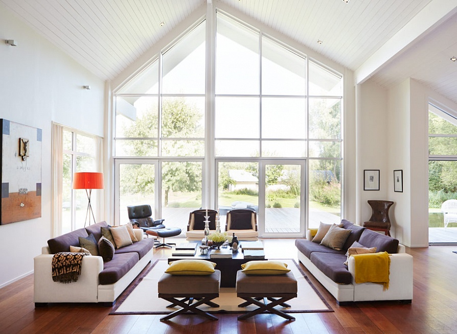В проекте дома обязательно предусматриваются большие панорамные окна, причем, по всему периметру дома. Шведы любят естественный свет, ощущая в нем нехватку. При строительстве применяются энергосберегающие стеклопакеты. Если дом компактный и небольшой, то в нем могут отвести под окно целую стену.