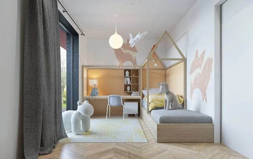 - оттенок кровати лучше оставить естественный древесный, подойдет также белый тон;