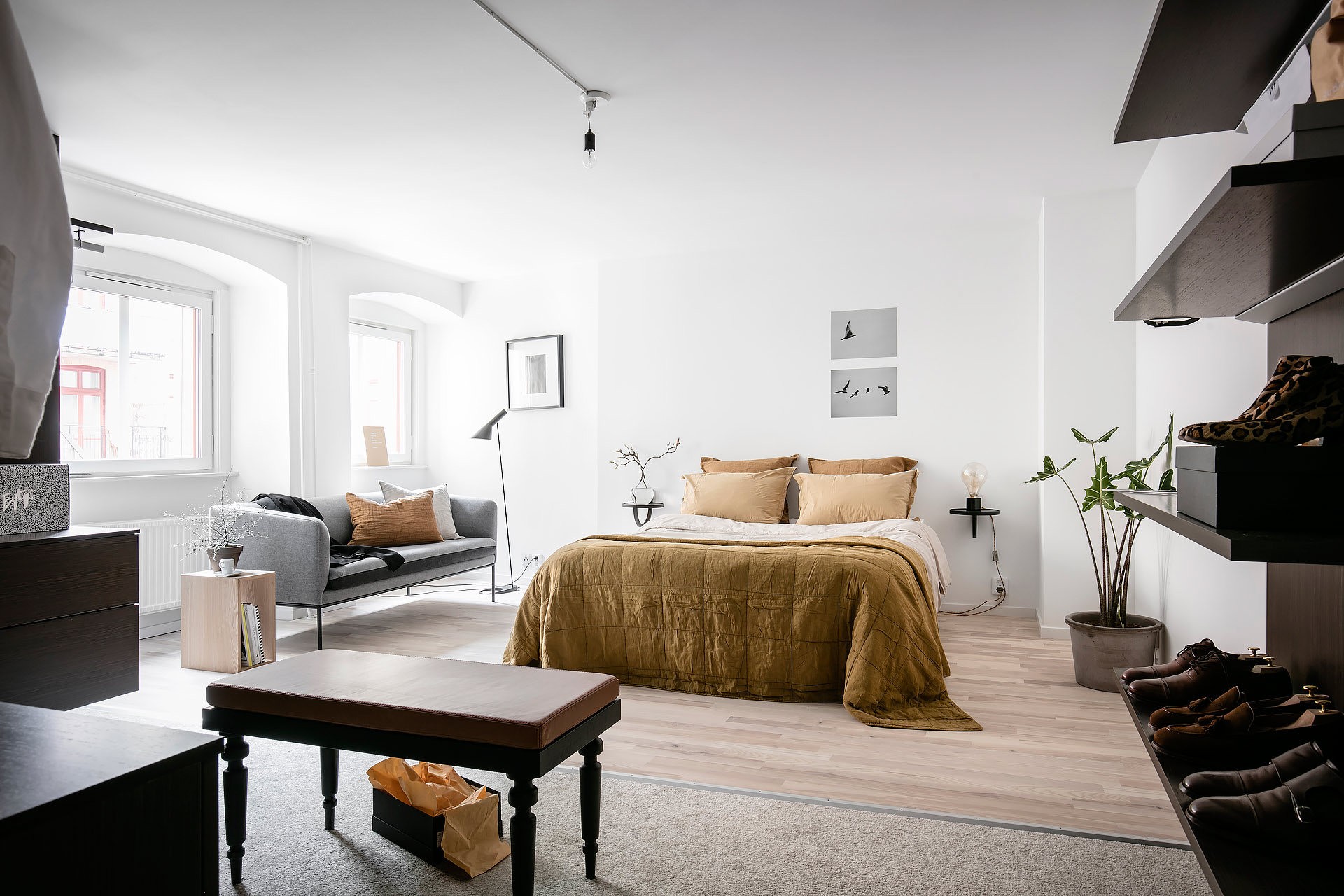 В заключение рассмотрим пример того, как можно придать сдержанному скандинавскому дизайну романтичность и элегантность. Цвет кофе с молоком, утончённые торшеры, подвязанные шторы, окантовка на покрывале, немного лепнины под потолком и рельефные подушки на скамье украшают интерьер, сохраняя общую концепцию.