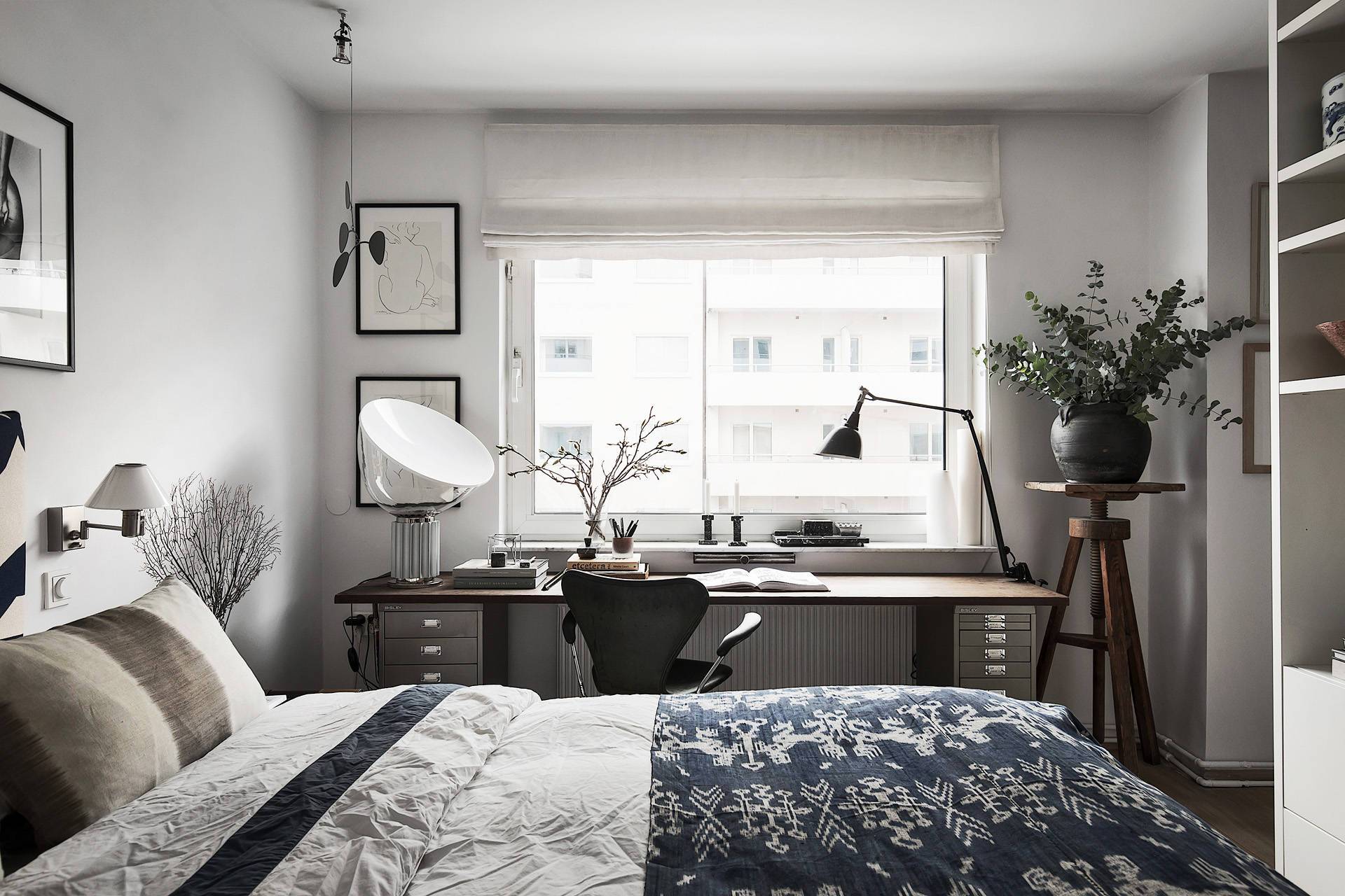 Спальня, включающая кабинет — распространённое решение для людей, работающих дома. Для этого в комнате устанавливают удобный рабочий стол, который попутно может служить и для хранения вещей обихода;