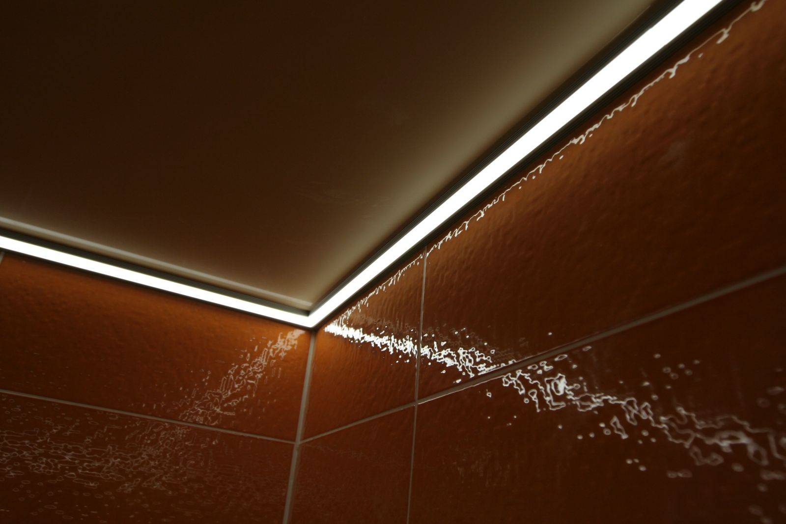 С помощью подсветки изнутри можно визуально увеличить помещение. Способов размещения светодиодных подсветок на потолочном покрытии достаточно много, к тому же это дает великолепную возможность осветить определенную часть помещения. Монтаж таких осветительных приборов требует зазора между перекрытием и потолком не меньше 2 см.