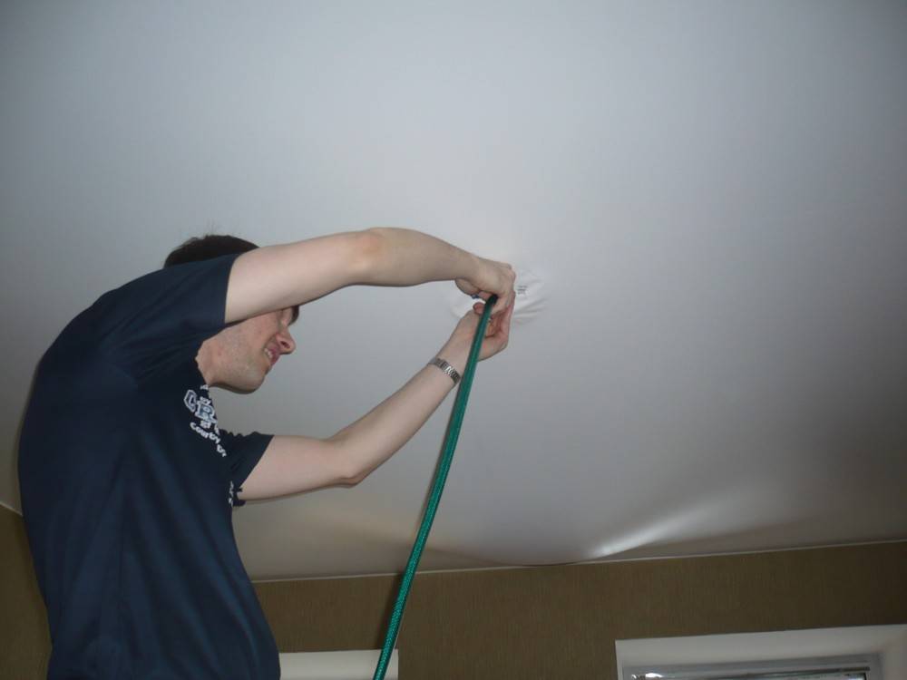 Слив воды с натяжного потолка самостоятельно до приезда специалистов