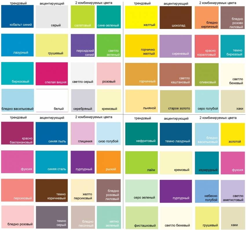 Многие задаются вопросом о том, как же пользоваться таблицей сочетания цветов в интерьере? Иногда это сложно и не совсем удобно. Ниже представлены таблицы сочетания цветов в доступном и понятном виде, где расписаны все популярные оттенки. Трендовый цвет — основной, далее идут подходящие к нему цвета, которые можно смело комбинировать. Акцентирующий цвет придаст интерьеру яркости и креативности.