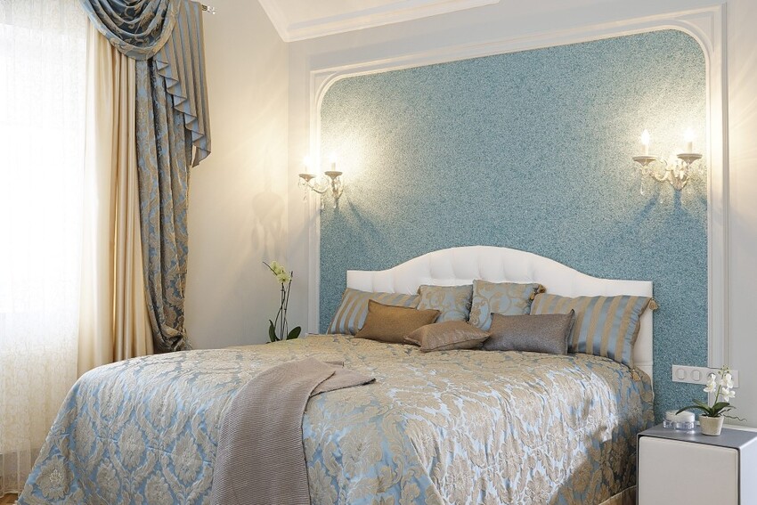 Также рекомендуется гармонизировать пространство с помощью других деталей интерьера. В этом случае подойдут подушки, покрывало, шторы того же цвета, что и акцентные обои.