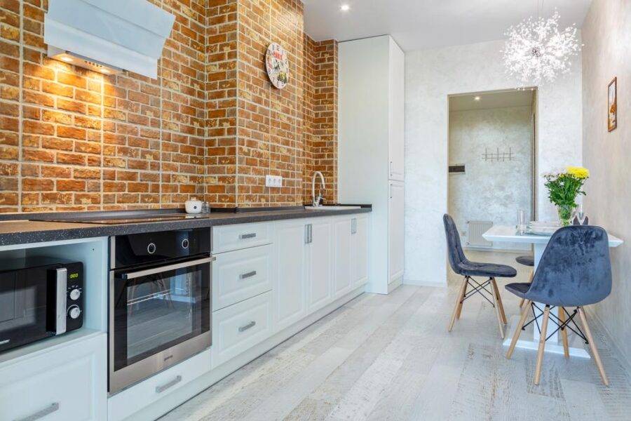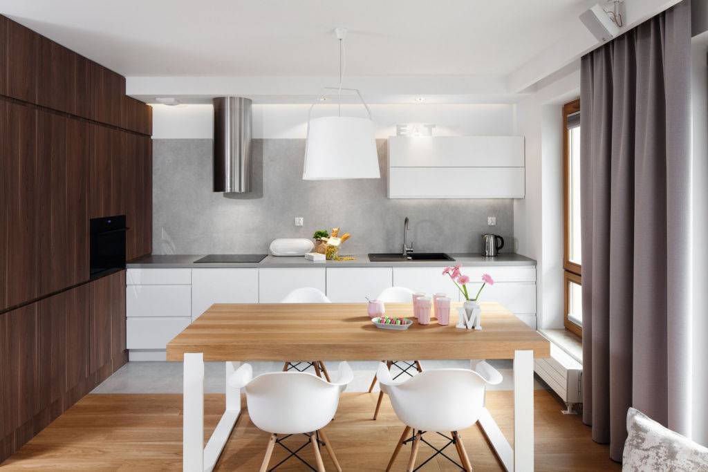 Такой дизайн еще имеет название однорядным. Здесь вся мебель и техника размещаются вдоль одной из стен. Углы при этом остаются незадействованными, а все свободное пространство отводится под обеденную зону. Линейные гарнитуры подходят для небольших кухонь и комнат средних размеров. А в квартире студии таким образом можно зонировать пространство.