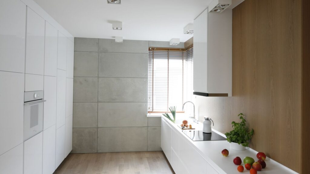 - стены делаются идеально ровными и гладкими. Их чаще всего окрашивают краской нейтральных оттенков. Если мебель в помещении темная, стены декорируются бежевым, белым или серым тонами. Зона фартука оформляется светлой керамической плиткой или стеклом;