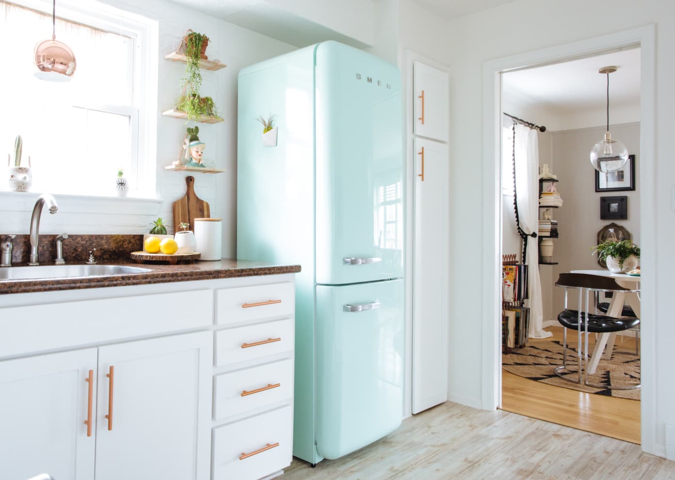 В любом случае — лампы, висящие над рабочей поверхностью, островом или большим столом, также являются сильным акцентом. Это украшение, которое в сочетании с отсутствием верхних шкафов означает, что сначала этот интерьер не воспринимается как кухня.