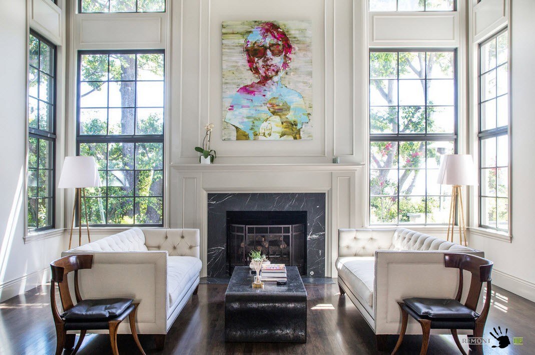Гостиные в частных домах часто могут похвастать не только большим количеством квадратных метров, но и высокими потолками, огромными окнами. В результате такие комнаты, залитые светом большую часть времени, оказываются буквально созданными для контрастного интерьера – темные рамы на фоне светлой отделки стен и потолка, темная древесина полов и соответствующий монохром в меблировке. Достаточно всего лишь одного яркого, акцентного элемента декора, чтоб разбавить атмосферу и придать интерьеру уникальности.