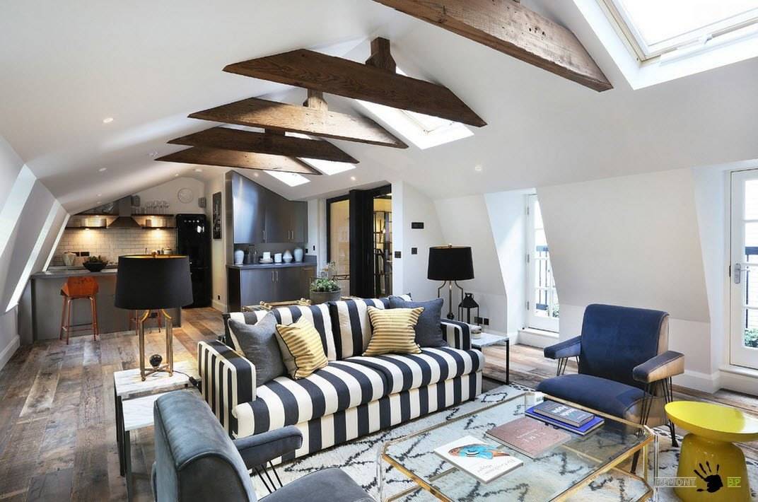 Особой популярностью в декорировании мансарды пользуется деревянная отделка, которая значительно улучшает микроклимат в чердачном помещении загородного дома или дачи, например это может быть вагонка, МДФ, ДСП панели, ламинат или шпон. Также довольно часто обшивают стеновую плоскость тканью или оклеивают самыми различными видами обоев.