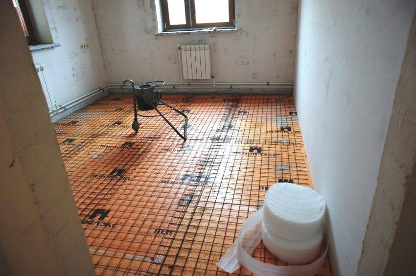 При монтаже системы гидравлического или электрического теплого пола, трубы системы выкладываются на армированную сетку (теплоизоляцию) под цементную стяжку.