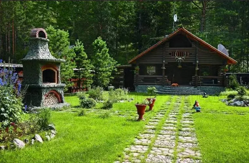 Каждая зона отделяется друг от друга плетеными изгородями, арками, увитыми вьющимися растениями, декоративным кустарником. Вокруг дома располагаются дорожки, газон и цветник. От ворот к дому ведет аллея, по краям которой по традиции высаживаются плодовые деревья, радующие глаз буйным цветением весной и сочными вкусными плодами летом. Также прекрасно впишутся в сельский интерьер на даче, к примеру, рябина или березки.
