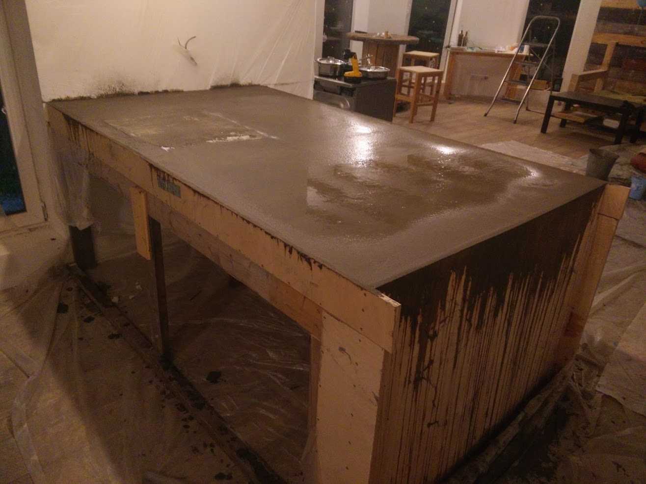 Каркас из брусьев аккуратно снимается. Столешница из бетона аккуратно переворачивается и устанавливается на бруски. Используя шлифмашинку с крупнозернистой насадкой и немного воды, счесывается верхний слой бетона, примерно в 1 мм. Далее поверхность необходимо очистить, промыть и тщательно пропылесосить. Вся поверхность столешницы затирается цементным раствором для заполнения мелких пор. Снова дается время для высыхания раствора.