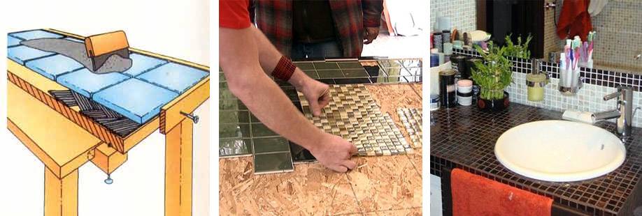 Сразу стоит сказать, что такой вариант больше подойдет столешнице для ванной. Представляет собой такой вариант простую укладку керамической плитки или кафеля на подготовленную горизонтальную поверхность с достаточной прочностью для удержания веса плитки и с некоторым запасом.