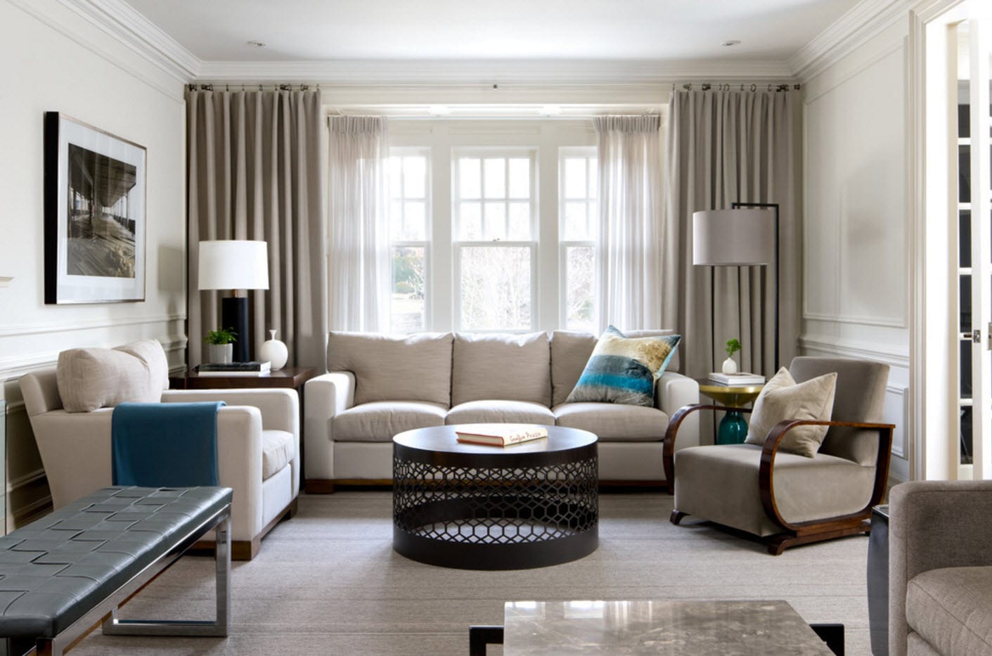 Во многих случаях в гостиной скромных размеров можно ограничиться тюлем. Комната будет казаться объемнее, если повесить его на всю стену, а не только над окном. Если есть желание скомбинировать тюль с более плотными шторами их необязательно вывешивать парно. Иногда достаточно одной портьеры.